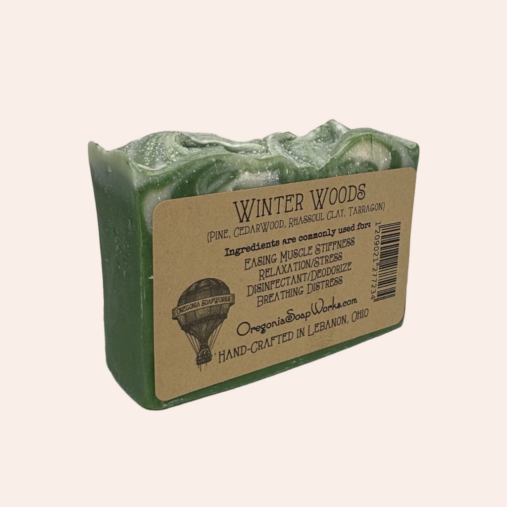 Travel this meandering path through the northern pines!  This seasonal variety is a definite favorite. Ingredients: Saponified Olive Oil, Coconut Oil, Palm Oil, Vitamin E, Turnip Root Extract, Essential Oils (Pine, Cedarwood), Nutrients (Ground Tarragon & Rhassoul Clay)   These therapeutic ingredients are commonly used for: Easing Muscle Stiffness Relaxation/Stress Disinfectant/Deodorize Breathing Distress   You will receive a hand cut bar of at least 4 oz.
